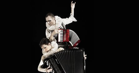 I scenerummets grafiske sort/hvide univers overgiver de sig sammen til musikken, der spænder fra storladent klassisk til ny udfordrende og højspændt akkordeonmusik komponeret af Jakob Brandt-Pedersen.