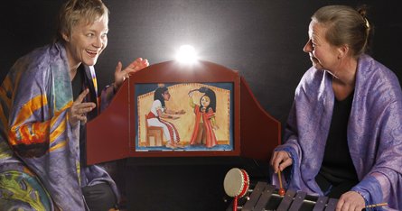 billeder efter klassisk japansk kamishibai-tradition. Børnene inddrages aktivt i forestillingens leg med musik, sang, bevægelse, som til sidst samles i en kort billed-teaterfortælling. Efter forestillingen udleveres et materiale i form af tekst og musik, så der er mulighed for videre oplevelser med musikteatrets verden hjemme i børnehaven eller på kulturskolen. Forestillingen er udviklet i samarbejde med Aarhus Kommunes Biblioteker, specielt med henblik på samarbejder mellem biblioteker og børnehaver samt 0.klassetrin. Ikke egnet til rum med scene og publikumsopbygning, da der kræves plads til at børnene kan bevæge sig.
