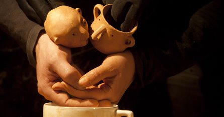 To dukkeførere står klædt i sort, på en helt bar scene, klar til at skabe det univers, fortællingen skal udspille sig i. Dukketeatret A MANO er en kærlighedshistorie om en lerfigur, der sidder i et butiksvindue, hvor han gang på gang forbipasseres af samtlige kunder i butikken, til fordel for de pænere porcelænsdukker. Vi følger lerfigurens mange forsøg på at undslippe sin indespærrede skæbne og oplever hans kærlighed for pottemagerens kop. En virkelig fin og smukt udført forestilling for store såvel som små.