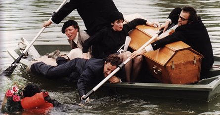 situation, hvor publikum følger det mest usandsynlige begravelsesoptog gennem byen.