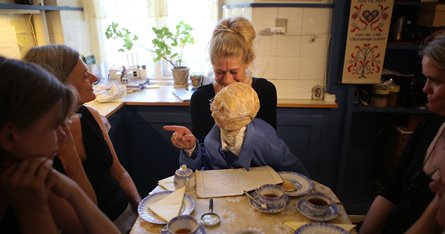 Publikum inviteres ind i et privat køkken, hvor de bænkes tæt omkring køkkenbordet. Der dækkes op med bedstemoderens blåblomstrede kaffestel, og der serveres kaffe fra komfuret. Mens tiden, livet og verdenshistorien filtreres gennem hendes køkkenvindue, blander den gamle dame sig efterhånden i skikkelse af en dukke, som Anette animerer.