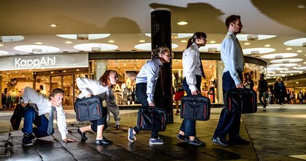Folk på gaden. Dyrene i den moderne storbys jungle. Hér finder man kontorarbejderne blandt andre arter. Oftest ses de haste på vej til det næste møde med mappen i hånden. Et ret almindeligt syn i det moderne bybillede. ReAct! vender dette billede på hovedet, når de leger med de scener, du måske, måske ikke, ser på byens torve og gader. Almindelige og forventede elementer mikses og danner ualmindelige og usædvanlige situationer og reAktioner. Tilbage til kontorarbejderne: Du ser dem vente på toget i myldretiden. Du ser dem haste over torvet, mens de nervøst ser på uret. Du ser dem danse…