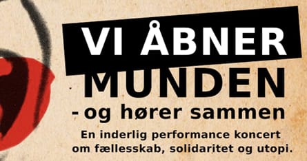 VI ÅBNER MUNDEN - OG HØRER SAMMEN er en legende autobiografisk og bundmusikalsk, politisk performancekoncert, der rejser debat omkring handlingslammelse, individualisme, fællesskab og spørgsmålet om vi stadig har noget at kæmpe for - sammen. Anika Kristensen Barkan og komponist Mika Forsling dykker ind i musikkens evne til at skabe fællesskab og forsøger at finde det beat, der kan rykke os ud af stolen og motivere os til handling.