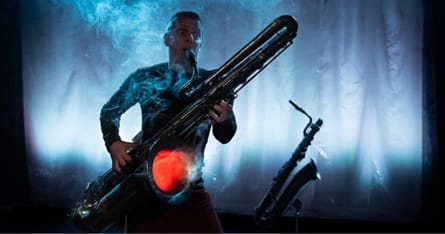 På scenen står en mand med sine saxofoner. Imens han spiller, fortæller han om en jazzsaxofonists sidste åndedrag og den saxofon, der var hans bedstefars arvestykke fra 1920. Historierne bringer os på besøg i Rafaelles instrumentbutik ved foden af en rygende vulkan, hvor der findes en kæmpestor contrabassaxofon. Mellem hvert et pust i saxofonen, under hver historie og mellem hver en sætning deler vi et åndedrag.