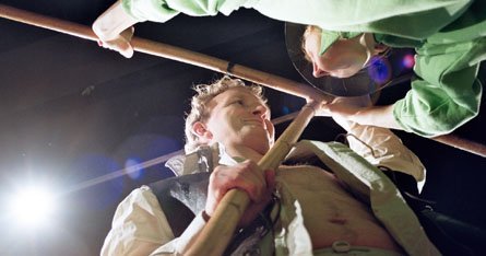 To skuespillere kæmper om rollen som Robin. Hun vinder, og han må tage alle de andre roller – som Lille John, Sheriffen af Nottingham og ikke mindst som Lady Marion. De fægter og slås med stokke, kårder og sværd, så publikum jubler – og de kysser, så der skriges i frydefuld afsky. En hurtig, spændende og forførende fortælling om Robin Hood og hans muntre svende.