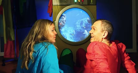 I RUNDT OG RUNDT befinder vi os i et vaskeri med en magisk vaskemaskine og en hel masse tøj. Tøjet skal vaskes, noget skal prøves og noget skal hænges op.