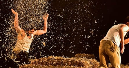 En intens og legende forestilling, hvor menneskekroppe og halmballer indgår i en kompleks koreografi.