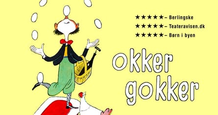”Okker Gokker" er en veloplagt musikforestilling baseret på kendte rim og remser fra Okker Gokker til Bro Bro Brille. Fire skuespillere leger med ord, lyde, musik og sang, og forestillingen er skræddersyet til de 2-5-årige, som bakser med sprogets musik og lyde. Rim, remser og små fortællinger mødes i en legeverden, hvor det meste kan ske. Der er både frikadeller og karameller i Fru Hansens kælder. Okker Gokker lægger æg, og alle laver skæg. Og hvem er det der banker, når det ikke er Peter Anker?