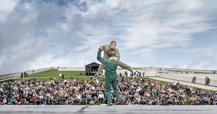 En udendørs pop-up forestilling, fyldt med masser af rå fysik, skæve stunts, jack-ass styrkeprøver, tå-krummende pinligheder og yderst charmerende mænd i sandaler!