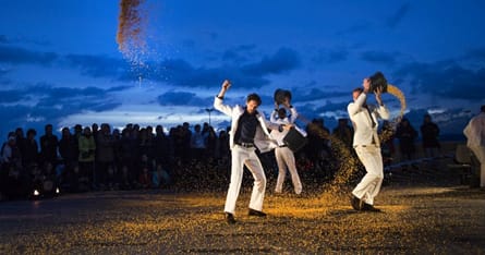 Fire mænd er klædt i hvide jakkesæt. De er bevæbnet med sneskovle og slæber posevis af gylden majs. Mændene inviterer os med på en fantasifuld, koreografisk og musikalsk rejse gennem tid og sted. Baïna[na] er en satire over menneskets forhold til penge og magt. I mødet mellem karaktererne i forestillingen og de rigelige mængder af ’guld’ bliver de først forført til nydelse, ekstase og jalousi – og til sidst til fuldstændig fortabelse. Performancekollektivet Le G. Bistakis forestilling er cirkus og dans, hvor de forskellige kunstneriske discipliner blandes på nye måder. Med Baïna[na] tegner kompagniet et satirisk, drømmeagtigt og absurd portræt af vores samtid, hvor hån og latter hersker.
