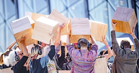 En skulptur der skabes af jer, det deltagende publikum; Gennem instruktioner i høretelefoner bliver I en del af et større koreografisk system, hvor I skaber formationer, bevæger objekter og former rummet imellem jer.