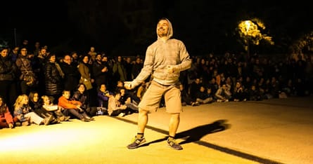 I den udendørs forestilling Molar, er danseren Quim Bigas indbegrebet af forskellige glædestilstande. Fra følelsen af det fedeste fodboldmål, til når man hører musik eller er hyper-glad over reklamernes glansbillede af glæden, som man kan købe i en sodavandsdåse.