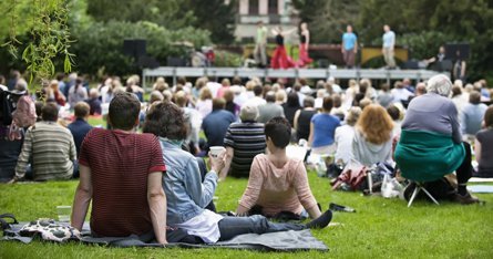 - Publikum sidder på græsset