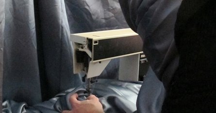 I en simpel systue med baglokale, små borde, symaskiner, taburetter og bunker af stof sættes publikum i scene.