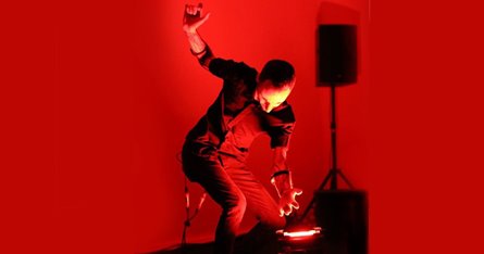 Performeren Marco Donnarumma påføres censorer. Lyden fra hans krops blodcirkulation, muskler og knogler opfanges og forstærkes og bliver til et "bioakustiske materiale" som den italienske multimedie-performaer, Marco Donnarumma, opfører live.