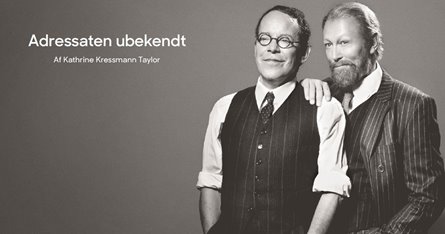 Kathrine Kressmann Taylors brevroman Adressaten ubekendt udkom i 1938, men taler stadig til os i dag. I 1932 starter en brevveksling mellem de to tyske venner Max og Martin, som sammen ejer et kunstgalleri i San Fransisco. De må skilles, da Martins kone vil hjem til Tyskland. Igennem halvandet år udveksler de breve over Atlanten. Langsomt begynder Martin i Tyskland at melde sig under Førerens faner, og brevvekslingen tager en meget ubehagelig drejning. Max, som er blevet i USA, er nemlig jøde.