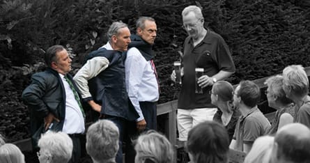 Tre midaldrende mænd dukker op. De er iført jakkesæt. De har noget, de skal aflevere .. Men de kan ikke rigtig huske ... Hvad? Eller hvor? Eller til hvem? .. Fortabte og forvirrede, snubler de, danser, løber eller falder i kor, klynger sig til hinanden mens de desperate forsøger at holde sammen på tingene for at nå deres glemte mål. .. Vær venlige at slukke jeres mobil telefoner! Og vær venlige at slå jeres hjerner fra! .. Således begynder "Tre af en Slags" - som en invitation til publikum om at åbne deres hjerter og hægte sig på et fuldstændig absurd komisk stykke fysisk teater - der er legende, sensitivt og fuldstændig spontant. .. "Tre af en Slags" - een stor surrealistisk ruchebanetur!