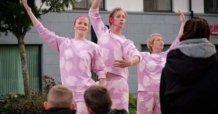 Tre dansere dukker op i en gul firkant. En gul bold ruller forbi, mens en stor gul kegle står ved siden. Så flyver røde jongleringskegler rundt omkring og en ny gul legekammerat melder sig. Gul er en udendørs forestilling af den prisbelønnede svenske koreograf Claire Parsons – en herlig blanding af dans, jonglering og musik med tre performere og en stor gul kegle og dens venner.