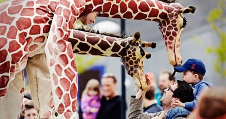 To giraffer i fuld naturlig størrelse og deres kalv akkompagneret af musikere, der skaber en drømmende afrikansk savannestemning omkring dem. Gå ikke glip af et fascinerende syn - eller glædeligt gensyn - når de elegante dyr stilfærdigt og nysgerrigt bevæger sig rundt på festivalpladsen, altid parat til venligt at tage kontakt med de små og store mennesker, som de møder på deres vej.