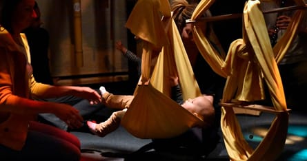I denne lydinstallation i naturlig størrelse kan babyer, småbørn og voksne lytte, føle, lege, hvile, hænge og kravle.